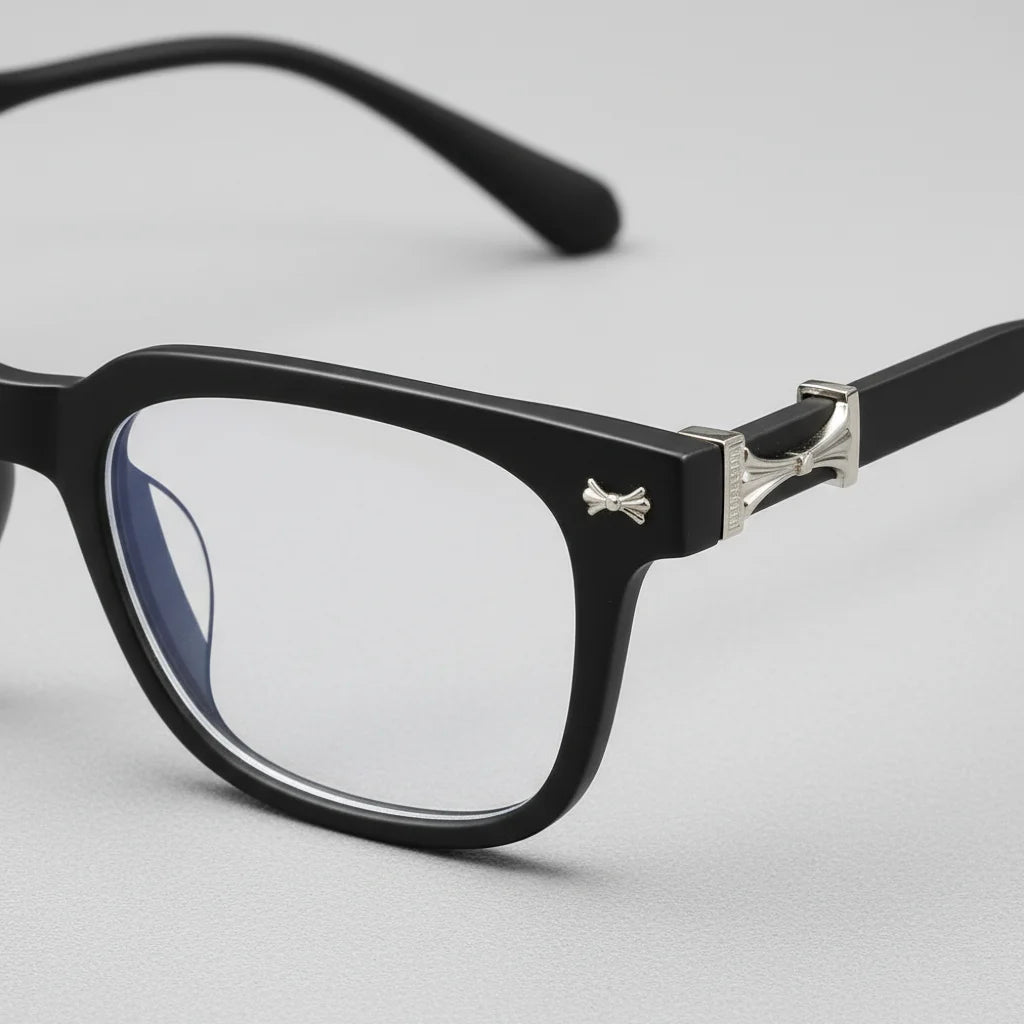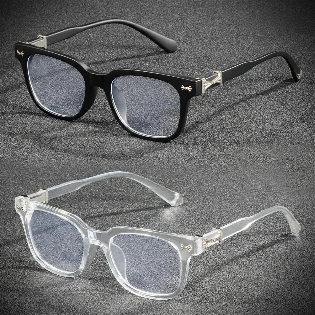 The CRIXALIS VisionGuard Duo includes two stylish frames: a classic black and a modern clear. Both feature a square, vintage-inspired design with elegant metal accents, ensuring you look great while protecting your eyes.